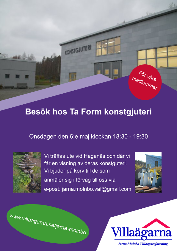 Vi träffas ute vid Haganäs och där vi får en visning av deras konstguteri. Vi bjuder på korv till de som anmäler sig i förväg till oss via e-post: jarna.molnbo.vaf@gmail.com