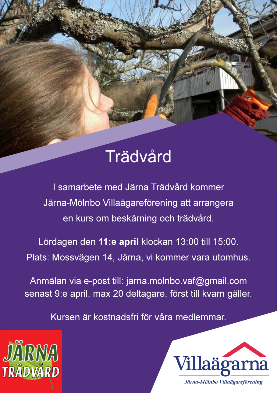 I samarbete med Järna Trädvård kommer Järna-Mölnbo Villaägareförening att arrangera en kurs om beskärning och trädvård.